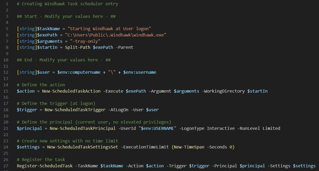 Wichtig ist, dass die Einträge davor angepasst werden. Die Zeile 12 funktioniert sowohl bei PCs die in einer Domäne sind, als auch bei PCs in einer Workgroup. Ich halte es für sinnvoll, Windhawk nur für einen expliziten Benutzer laufen zu lassen und zum Beispiel einen lokalen administrativen Account davon auszunehmen – nur für den Fall, dass man den Explorer abschießen sollte ![]()