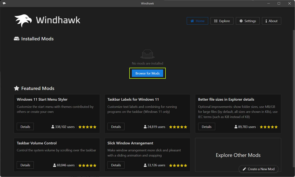 Ein Klick auf Browse for Mods bringt einem dann auch gleich zum Taskbar Styler.