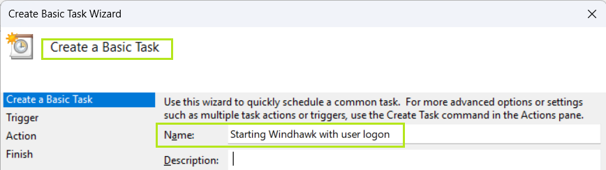 Create a Basic Task / Name: Starting Windhawk with user logon