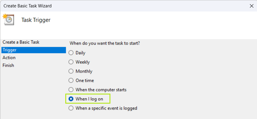Next öffnet den Dialog für den Task Trigger, wo When I log on ausgewählt werden soll.