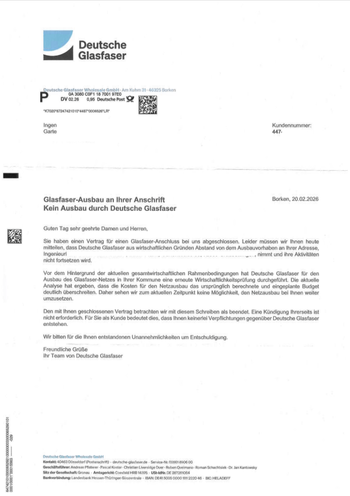 Ich halte gerade das zweite Schreiben in den Händen, das mir mitteilt: „Kein Ausbau durch Deutsche Glasfaser“. Die Begründung? „Wirtschaftliche Gründe“ und eine erneute „Wirtschaftlichkeitsprüfung“ aufgrund der aktuellen Rahmenbedingungen.