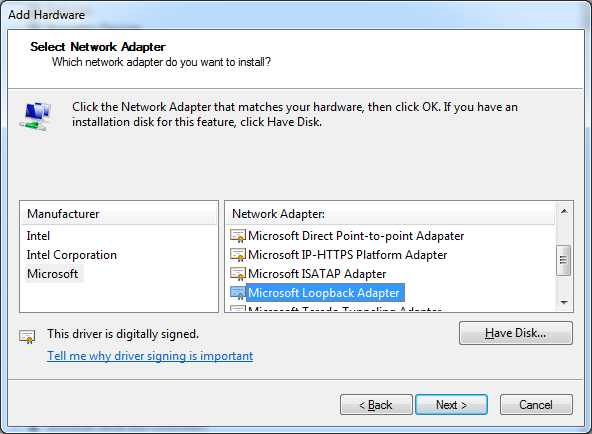 - Im nun erscheinenden Feld Network Adapters auswählen und unter Manufacturer (Microsoft) den Microsoft Loopback Adapter auswählen