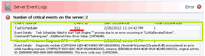 - Nun schauen wir in den inzwischen fertig gestellten “Detailed Network Report” rein welche Fehler / Events den hier gemeldet werden. Als Beispiel hier der TaskScheduler mit dem Event 311