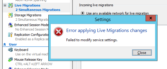 Kürzlich hatte ich das Problem, dass ich auf einem Hyper-V Server 2012 R2 die Einstellungen für eine Live Migration nicht speichern konnte. Von der Hyper-V MMC welche auf meinem Admin-Rechner lief bekam ich folgende Rückmeldung: