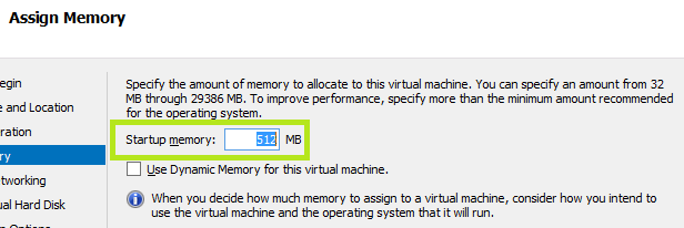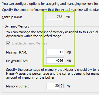 Der Grund für dieses Verhalten während der Installation ist folgender. Läuft das Setup von Windows Server, dann ist hier noch kein Dynamic Memory aktiv – sprich, die VM kann nicht mehr Speicher allokieren, als die 512MB welche als Startkonfiguration zugewiesen sind. Setup spuckt aus diesem Grund die interessantesten Fehlermeldungen aus. Lösen lässt sich das Problem einfach dadurch, dass 768MB hier eingetragen werden, und schon kann man das aktuelle Release des Windows Servers problemlos installieren.