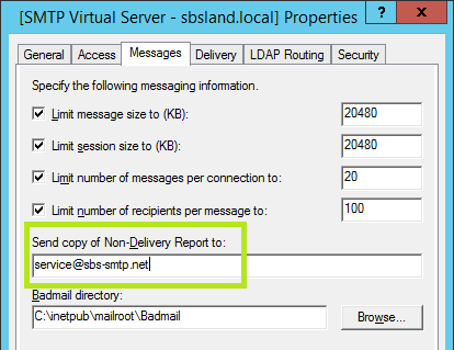 SMTP-Relaying ist in kleinen Firmennetzwerken kein Thema, dass heißt das alle Endgeräte unter der internen Domain (sbsland.local) ihre Mails versenden. Der Fall, dass weitere interne Domains den SMTP Server als Relay verwenden sollen beschreibe ich weiter unten als Zusatz. - Damit wir mit bekommen, ob Mails nicht versendet werden können wird eine funktionale E-Mail-Adresse mit Postfach unter Messages konfiguriert