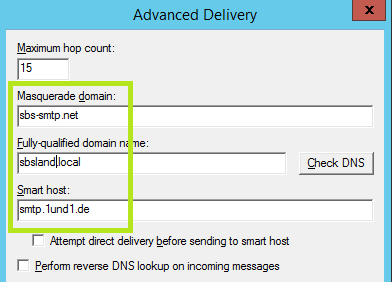 Da wir diese Konfiguration auf unserem SBS durch führen welcher die Domain sbsland.local im DNS hostet ist diese auch über Check DNS auflösbar. Als SMART Host, also als Server an den im Internet die Mails gesendet werden tragen wir smtp.1und1.de ein. Dieser muss natürlich auch von unserem Server erreichbar sein – hier einen nslookup smtp.1und1.de und ggf. einen tracert smtp.1und1.de zum Test ausführen - Zum Abschluss prüfen wir noch, ob sbsland.local als Domain erscheint
