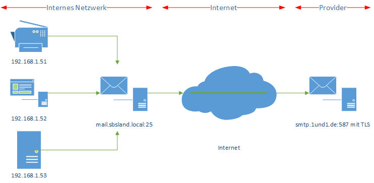 Real betrachtet ist dieser Ansatz für eine kleine Firma nicht wirklich sinnvoll! - Wir bauen uns einen eigenen, internen SMTP-Server welcher sich mit einem Mail-Account gegenüber einem Provider wie z.B. 1&1 authentifiziert und intern Mails mit einer “loseren” Sicherheit entgegen nimmt …