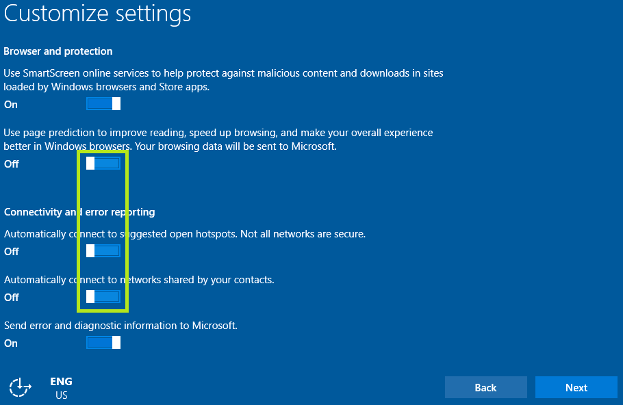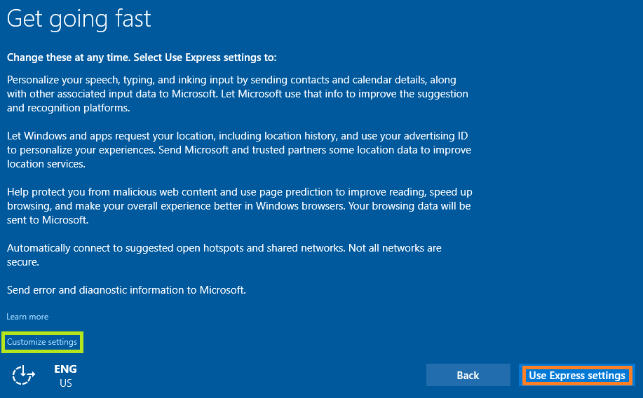 Werden hier die Express-Einstellungen (use Express settings) verwendet, dann übermittelt Windows verschiedene Daten an Microsoft. Alternativ kann über Customize settings eine Anpassung/Auswahl dieser erfolgen.