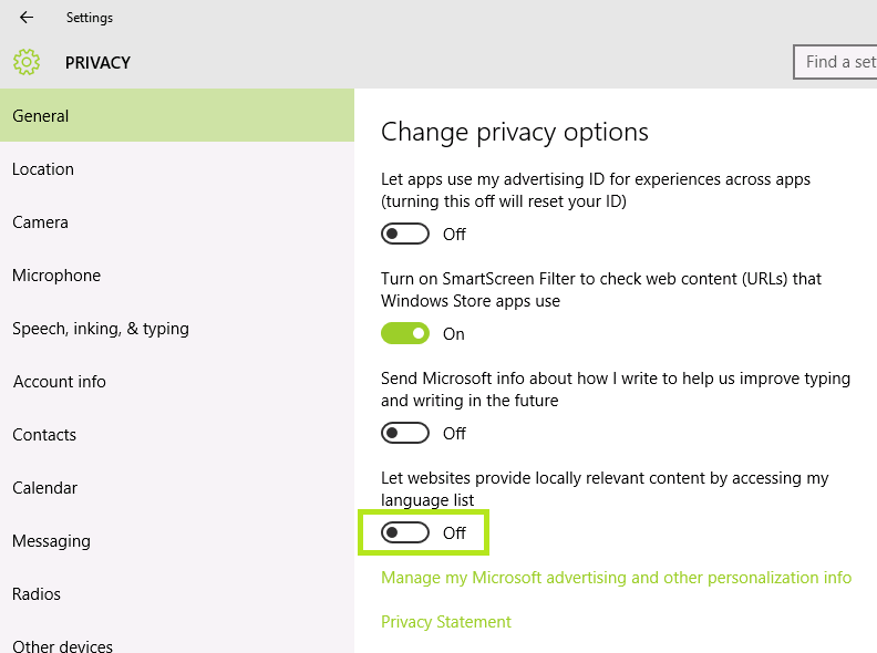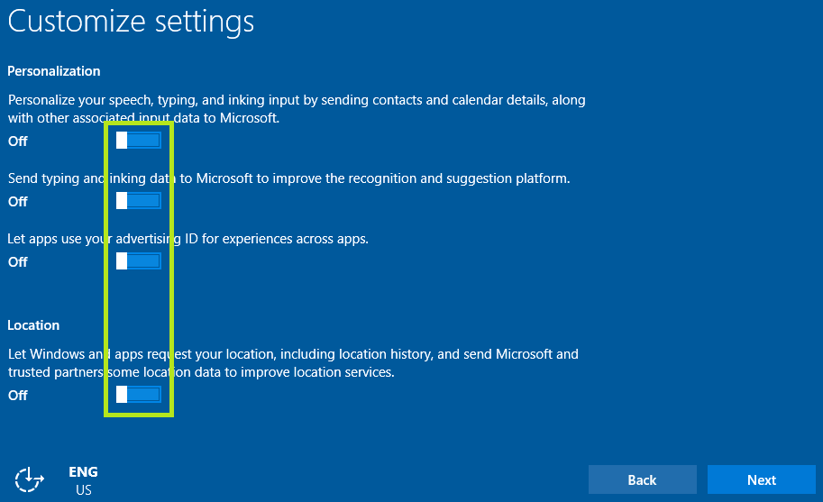 Im Bereich Personalization und Location stelle ich daher alle Schalter von On auf Off.