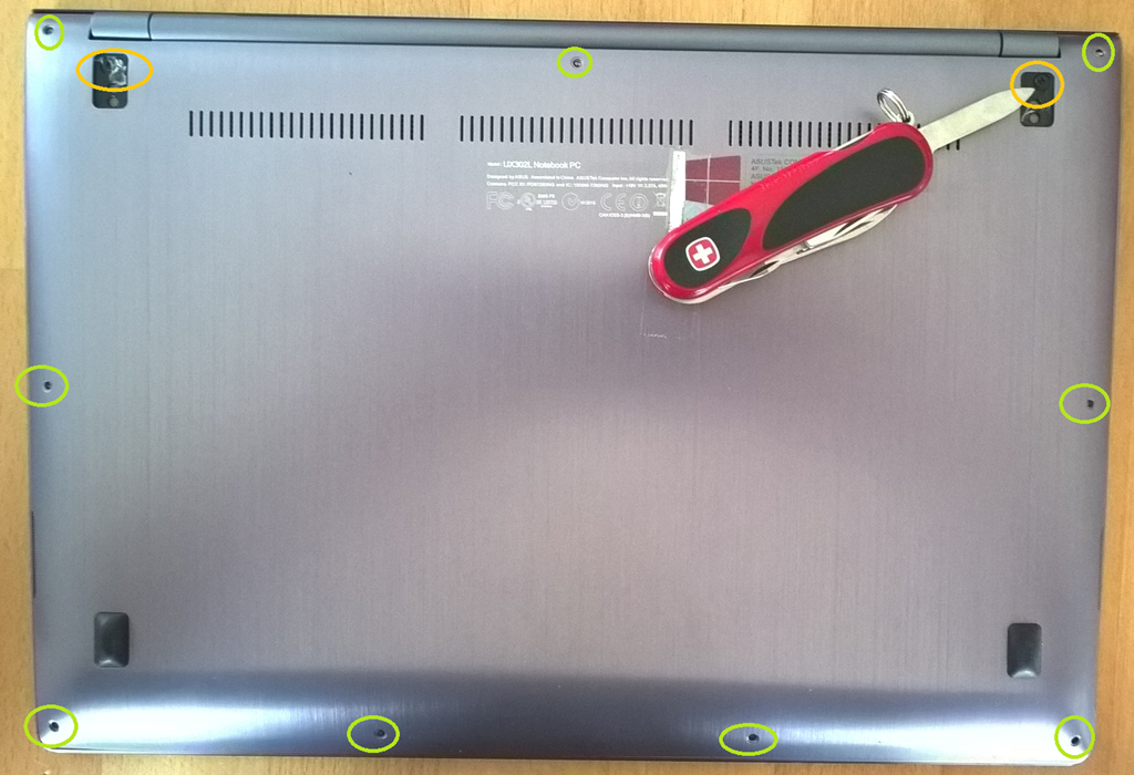 Der Bodendeckel des Zenbook ist über 9 kleine Schrauben (PH0) welche direkt sichtbar sind und über 2 verdeckte Schrauben (T5) mit dem Notebook verbunden. Um an die verdeckten Schrauben zu gelangen müssen die beiden Gummifüße entfernt und am Ende wieder angeklebt werden, dass habe ich mit dem Taschenmesser erledigt.