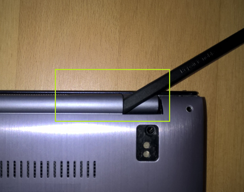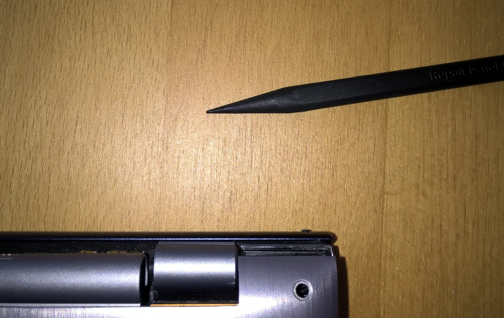 Nach dem Lösen der Schrauben ist allerdings der Boden immer noch am Notebook eingehakt. Diesen löst man durch den Kunststoffdorn wie im folgenden Bild gezeigt, durch einschieben und sanften Druck nach oben.