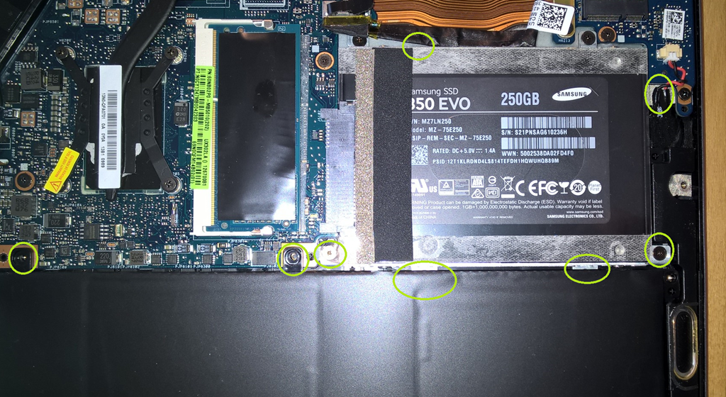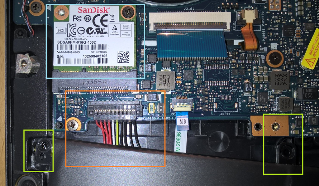 Darüber hinaus sehen wir hier noch die SanDisk SSD (16GB) welche wenn viel Platz notwendig ist ebenfalls gegen eine größere getauscht werden kann und zwei der Befestigungsschrauben des Akkus.
