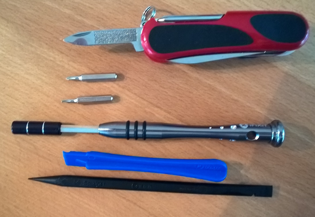 Mit Ausnahme des Taschenmessers finden sich die anderen Dinge in dem iFixit Pro Tech Toolkit. Die passenden Werkzeuge aus dem Baumarkt tun es hier aber ebenfalls! Das von mir verwendete Taschenmesser ist ein Wenger (nicht Victorinox), welches als “kleine Klinge” eine Nagelfeile besitzt. Damit lassen sich problemlos Kunststoff und Gummifüße ohne diese zu beschädigen entfernen.
