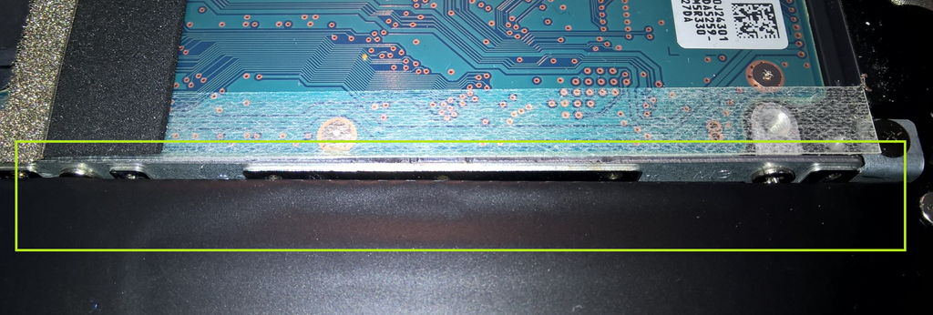 Nach dem Einbau der SSD habe ich die Schutzfolie wieder aufgebracht. Diese dient dazu einem elektrischen Kontakt zwischen der Festplatte und dem Bodendeckel zu verhindern. Nun hat die Samsung SSD keine leitenden Teile an ihrer Oberfläche, aber bevor ich die Schutzfolie weg werfe habe ich sie einfach wieder drauf geklebt, was im folgenden Bild zu sehen ist.