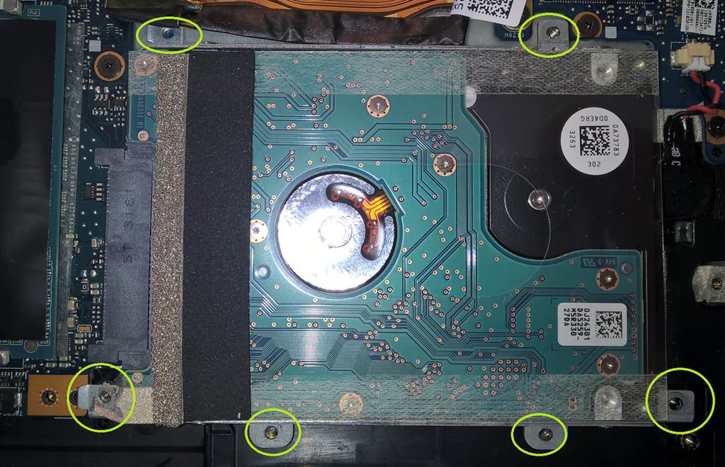 Die oben markierte Festplatte ist mit insgesamt 6 Schrauben mit dem Board verbunden. Damit wir an diese ran kommen, muss auch noch der Akku gelöst werden! Vorsicht – hier nicht die Verbindung mit dem Board beschädigen. Es reicht wenn der Akku rechts 5mm nach unten gerückt werden kann.