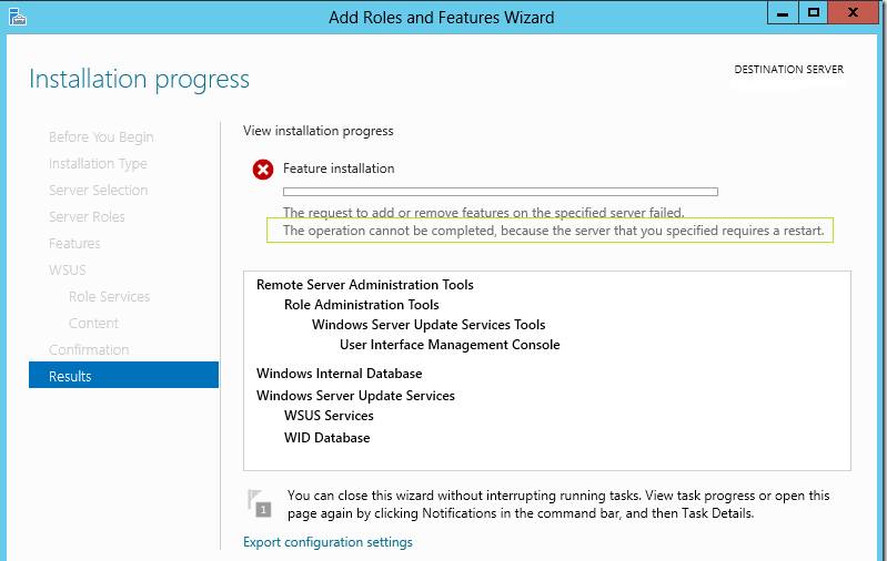 Danach funktionierte das Hinzufügen der WSUS Rolle ohne Probleme. Wer übrigens einen SQL Server Express für die SUSDB verwendet kann die WID nach erfolgter Installationn des WSUS wieder entfernen.