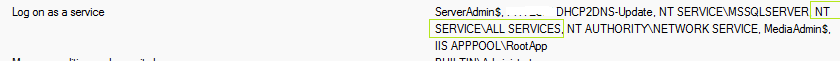 Computer Configuration/Policies/Windows Settings/Security Settings/Local Policies/User Rights Assignment/Log on as a service