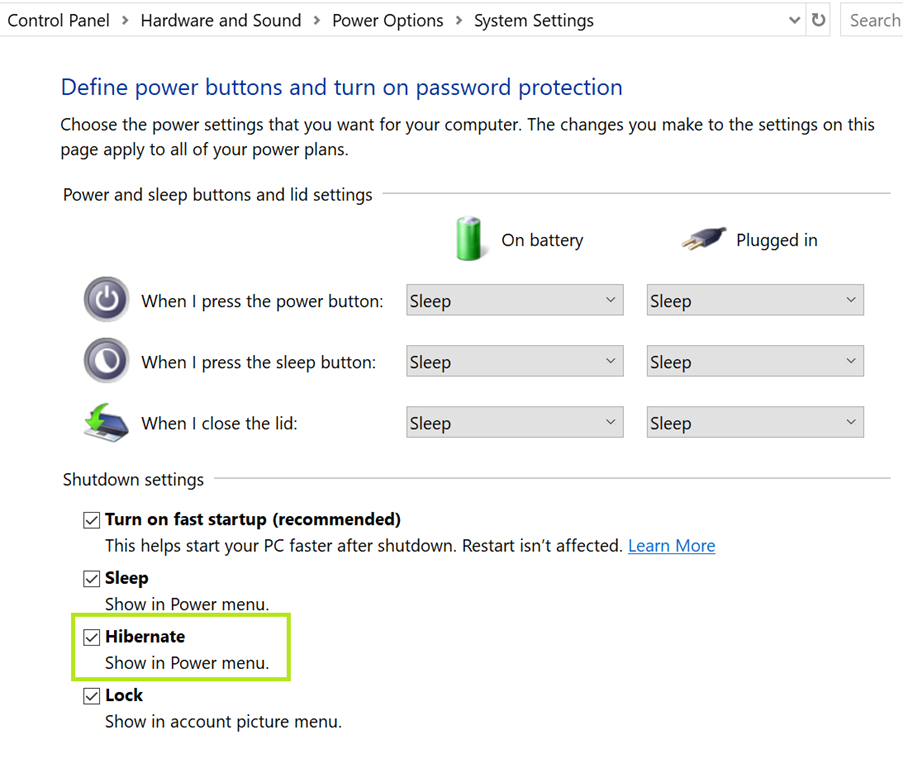 Nun ist der Hibernation Mode aktiviert, damit dieser aber in den Optionen zu herunterfahren mit angezeigt wird, muss man noch einen Haken in den Energiesparoptionen setzen und diese neuen Einstellungen abspeichern.