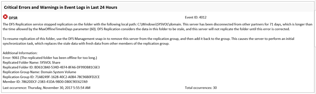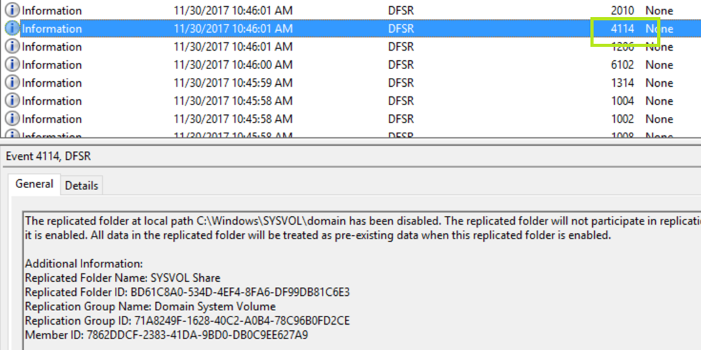 Im Eventlog finden wir danach die ID 4114, optional kann auf dem DC einfach den Service File Replication (FRS) bzw. DFS Replication (DFSR) neu gestartet werden.