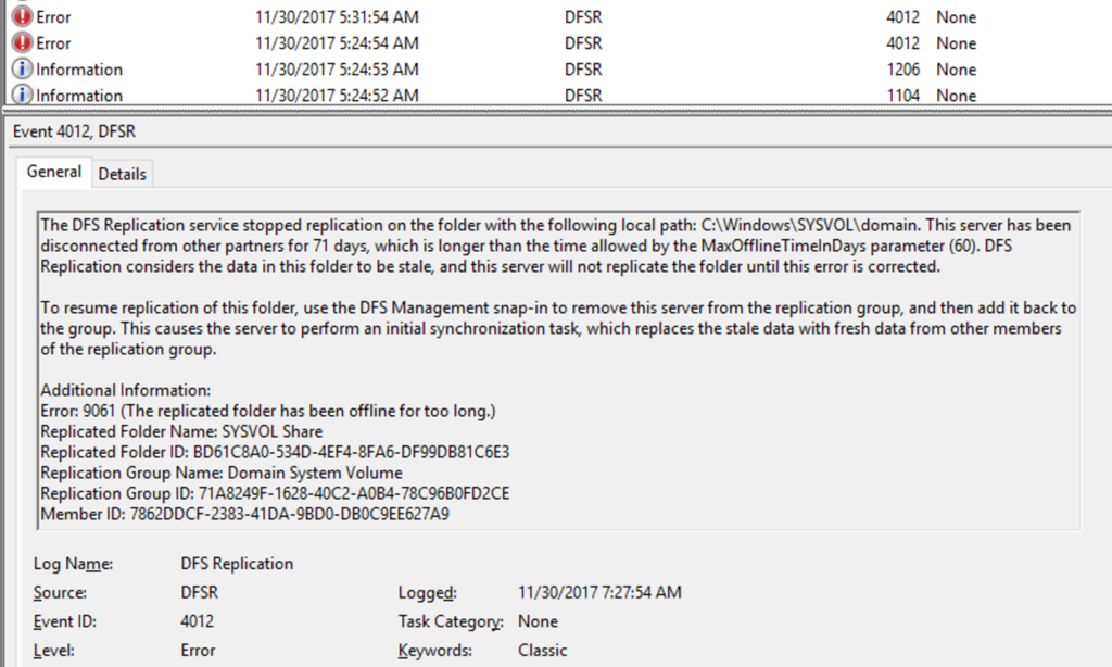 Eine vor gut 2 Monaten stattgefundene Migration von SBE 2011 auf Windows Server 2016 SBE hat wohl zu Problemen bei der Replikation geführt. Zumindest meldete rund 71 Tage danach der Zielserver das er ein Problem mit der Replikation hätte.