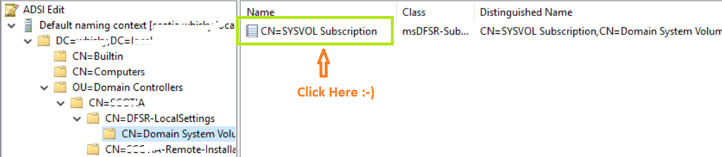 Dort öffnen wir den CN=SYSVOL Subscription mit einem Doppelklick (Grüner Kasten im Screenshot oben).
