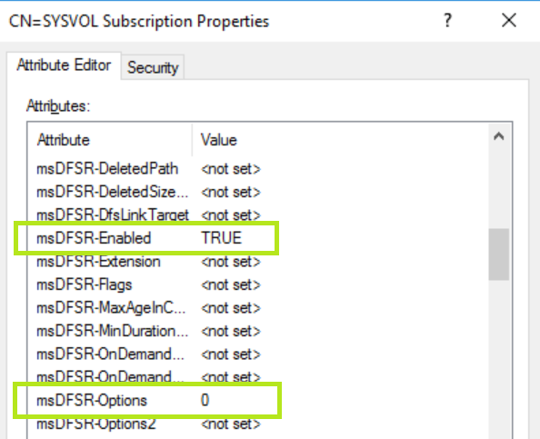 Hier finden wir die beiden Einträge msDFSR-Enabled und msDFSR-Options, welche wir von …