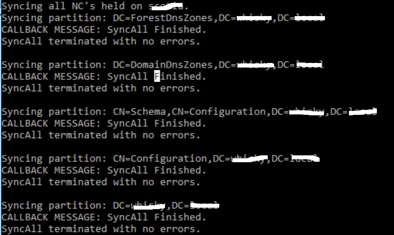 Funktioniert dieser Call, dann meldet repadmin insgesamt 5x die Meldung SyncAll terminated with no errors.