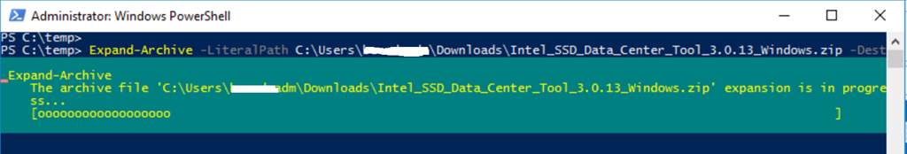 Expand-Archive -LiteralPath C:\Users\<Username>\DownloadsIntel_SSD_Data_Center_Tool_3.0.13_Windows.zip -DestinationPath '\\<Hyper-V-Hostname>\c$\temp\intel-ssd\' -Force