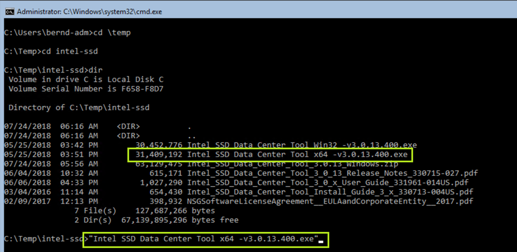 Auf dem Hyper-V Host befindet sich im Verzeichnis C:\Temp\intel-ssd das Intel SSD Data Center Tool welches wir nun in der richtigen Version (x64) installieren müssen: