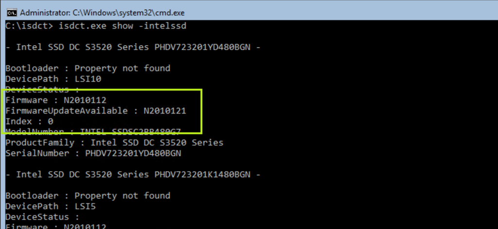 - Intel SSD DC S3520 Series PHDV723201YD480BGN - Bootloader : Property not found DevicePath : LSI10 DeviceStatus : Firmware : N2010121 FirmwareUpdateAvailable : The selected Intel SSD contains current firmware as of this tool release. Index : 0 ModelNumber : INTEL SSDSC2BB480G7 ProductFamily : Intel SSD DC S3520 Series SerialNumber : PHDV723201YD480BGN - Intel SSD DC S3520 Series PHDV723201K1480BGN - Bootloader : Property not found DevicePath : LSI5 DeviceStatus : Firmware : N2010121 FirmwareUpdateAvailable : The selected Intel SSD contains current firmware as of this tool release. Index : 1 ModelNumber : INTEL SSDSC2BB480G7 ProductFamily : Intel SSD DC S3520 Series SerialNumber : PHDV723201K1480BGN - Intel SSD DC S3520 Series PHDV717503PB480BGN - Bootloader : Property not found DevicePath : LSI6 DeviceStatus : Firmware : N2010121 FirmwareUpdateAvailable : The selected Intel SSD contains current firmware as of this tool release. Index : 2 ModelNumber : INTEL SSDSC2BB480G7 ProductFamily : Intel SSD DC S3520 Series SerialNumber : PHDV717503PB480BGN - Intel SSD DC S3520 Series PHDV717501MN480BGN - Bootloader : Property not found DevicePath : LSI7 DeviceStatus : Firmware : N2010121 FirmwareUpdateAvailable : The selected Intel SSD contains current firmware as of this tool release. Index : 3 ModelNumber : INTEL SSDSC2BB480G7 ProductFamily : Intel SSD DC S3520 Series SerialNumber : PHDV717501MN480BGN