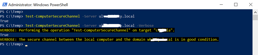 Test-ComputerSecureChannel liefert True oder False zurück, je nachdem wie der Zustand der Verbindung zwischen dem PC und der Domain (Domain-Controller) ist.