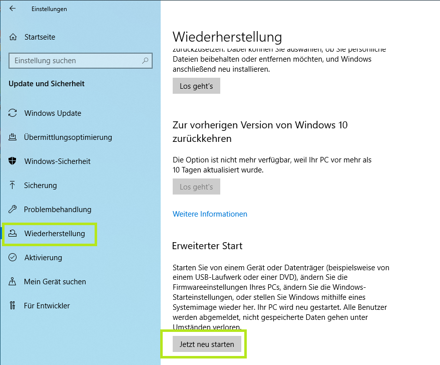 Windows Einstellungen / Update und Sicherheit / Wiederherstellung / Erweiterter Start