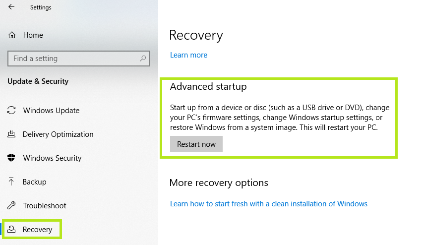 Windows Settings / Update & Security / Recovery / Advanced startup / Restart now