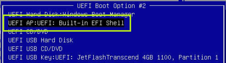 Um diese Möglichkeit zu aktivieren, habe ich unter UEFI Boot Option #2 die [UEFI USB Hard Disk] gegen die UEFI: Built-in EFI Shell getauscht.