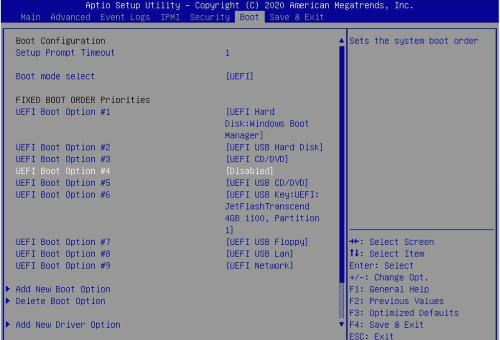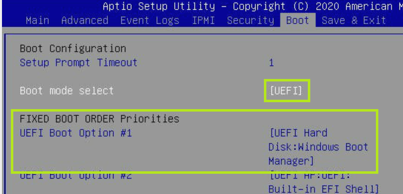 Sollte der Server im BIOS auf Boot mode select [UEFI] stehen, so wird dieser Wert durch das Update auf [DUAL] geändert und der Windows Boot Manager kann das Betriebssystem nicht mehr laden. Dann einfach nochmals ins BIOS gehen und die Option auf [UEFI] ändern, was den Windows Boot Manager an seiner ehemaligen Position wieder einblendet.