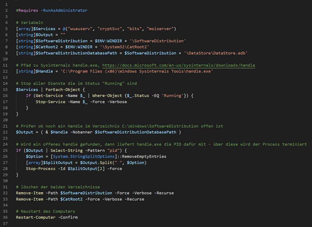 Mit PowerShell lässt sich das auf elegantere Weise lösen, allerdings wollte ich die Prüfung ob noch Dateien im SoftwareDistribution-Verzeichnis geöffnet sind nicht zu komplex gestalten. Darum habe ich handle.exe von Sysinternals als externes Programm verwendet.