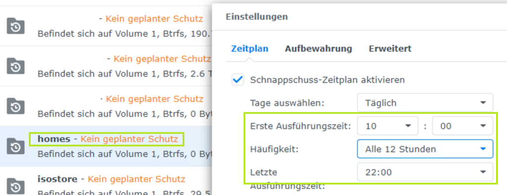 Nach der Installation kann unter Schnappschüsse, die entsprechende Freigabe ausgewählt und ein Zeitplan für die Ausführung konfiguriert werden. Für Freigaben mit wenig Änderungen genügt es den Schnappschuss 1x am Tag zu erstellen, für Freigaben wie die Benutzerverzeichnisse (homes) ist es sinnvoll eine höhere Frequenz von zwei oder auch 3x am Tag in Betracht zu ziehen.