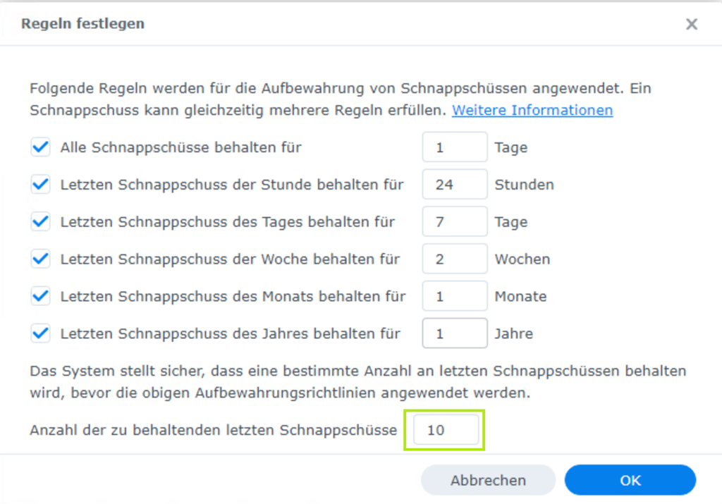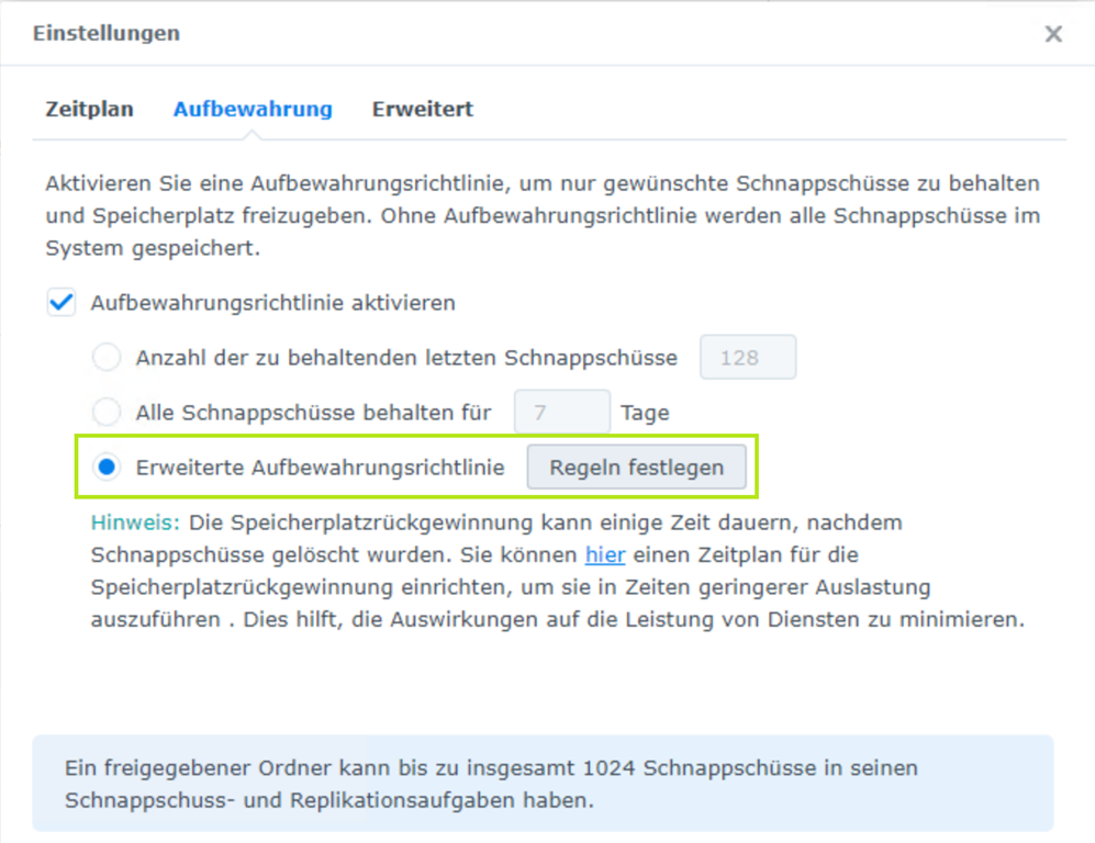 Zusätzlich muss noch die Aufbewahrungsrichtlinie definiert werden, sonst erfolgt die Erstellung von Schnappschüssen bis der Speicherplatz aufgebraucht ist. Da die Snapshots nur die geänderten Blöcke sichern, entsteht hier kein großer Speicherbedarf. In der Erweiterten Aufbewahrungsrichtlinie findet sich nach meiner Meinung schon eine sinnvolle Grundeinstellung, bei der ich lediglich die Anzahl der zu behaltenden Schnappschüsse von 5 auf 10 ändere.