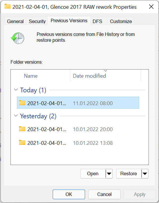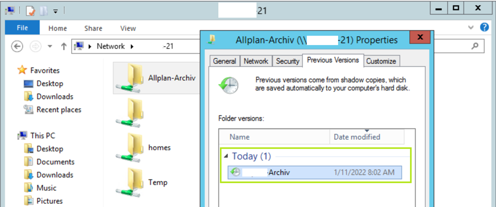Nachdem der erste Schnappschuss erstellt wurde, erscheint dieser als Vorgänger Version oder Previous Version im Windows Explorer.