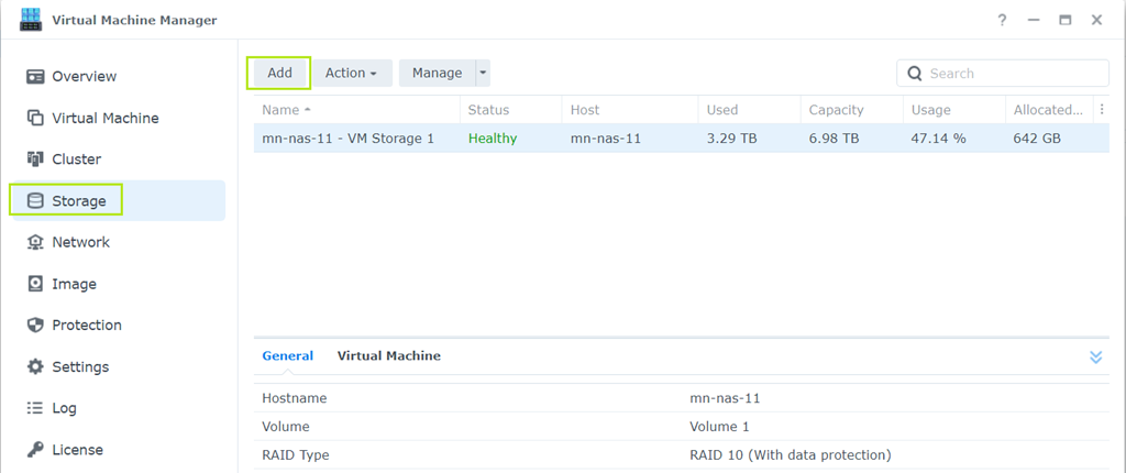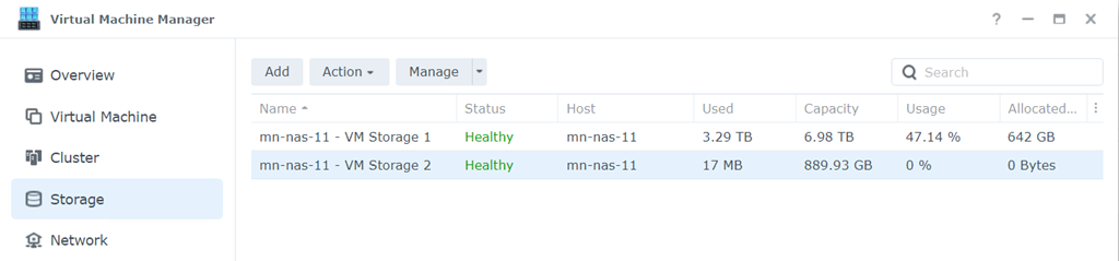Damit ist das Volume 2 erstellt und kann verwendet werden. Für mich war der Grund, darauf eine VM laufen zu lassen, die von der deutlich besseren Performance der Samsung SSDs profitiert. Dazu muss ich das neue Volume 2 im Virtual Machine Manager noch hinzufügen, was über das Menü Storage/Add möglich ist.