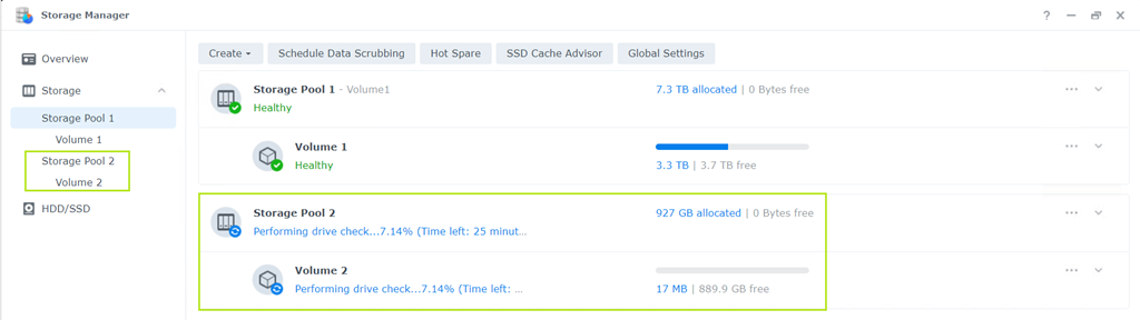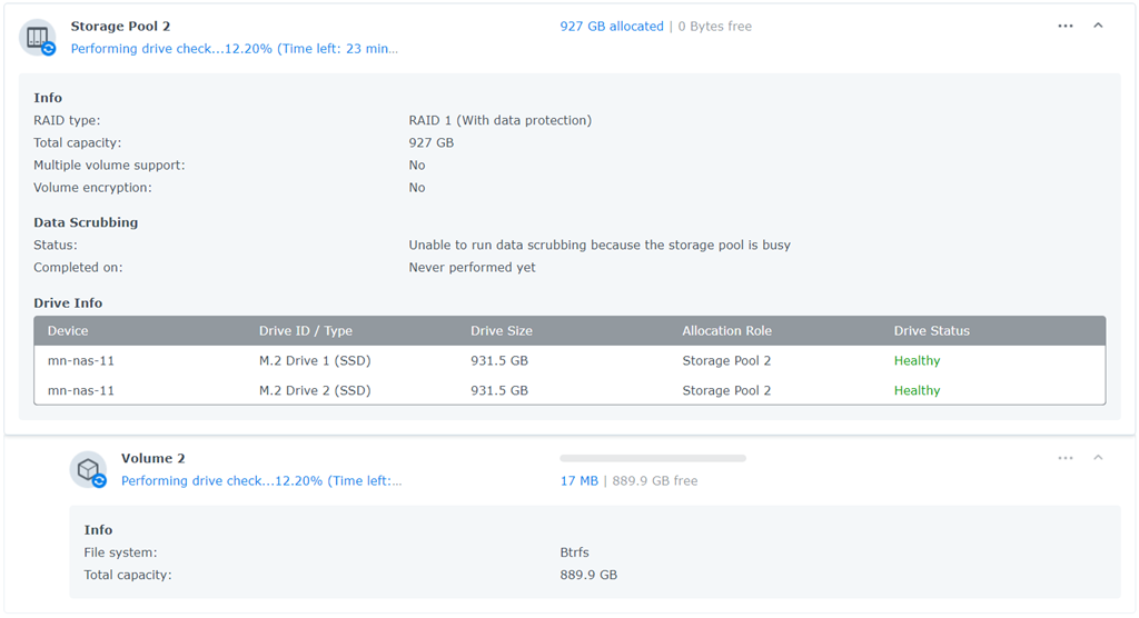 Öffnet man den Storage Pool 2 findet man die beiden Samsung M.2 SSDs mit ihrer Kapazität (Drive Size) und darunter das Volume 2 mit einer knapp darunter liegenden Kapazität von 889,9GB