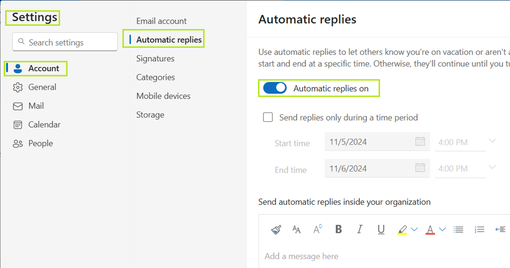 Dort kann nun unter View/View Settings/Settings/Account/Automatic replies/Automatic replies on eine entsprechende Abwesenheitsnotiz konfiguriert werden.
