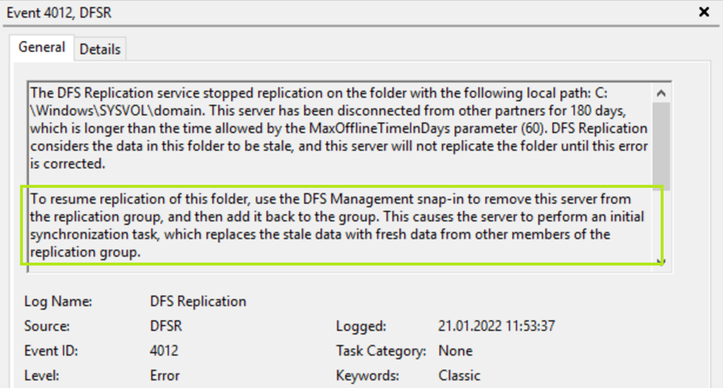 Im Eventlog finden wir danach die ID 4114, optional kann auf dem DC einfach den Service File Replication (FRS) bzw. DFS Replication (DFSR) neu gestartet werden.