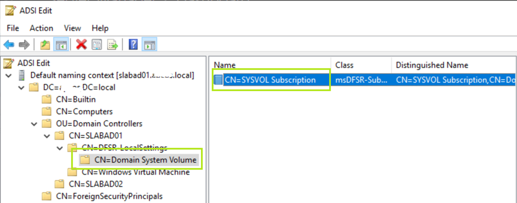 CN=SYSVOL Subscription,CN=Domain System Volume,CN=DFSR-LocalSettings,CN=<the server name>,OU=Domain Controllers,DC=<domain>