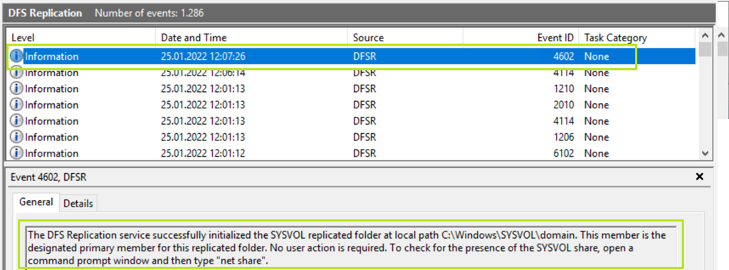Im DFS Replication Ereignisprotokoll finden wir ebenfalls einen Eintrag, dass nun mit DFSR repliziert wird.
