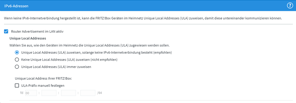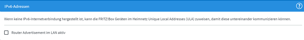 Die FRITZ!Box 7580 bekam so ein Update, genau genommen die Version 07.30 des FRITZ!OS und dabei wurde in den IPv6-Einstellungen des Router Advertisement im LAN wieder aktiviert, welches ursprünglich abgeschaltet war.