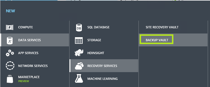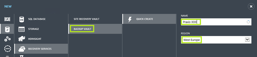 Auswahl von Recovery Services / +New, links im Microsoft Azure Portal. Damit öffnet sich folgender Dialog aus der wir BACKUP VAULT / QUICK CREATE auswählen.