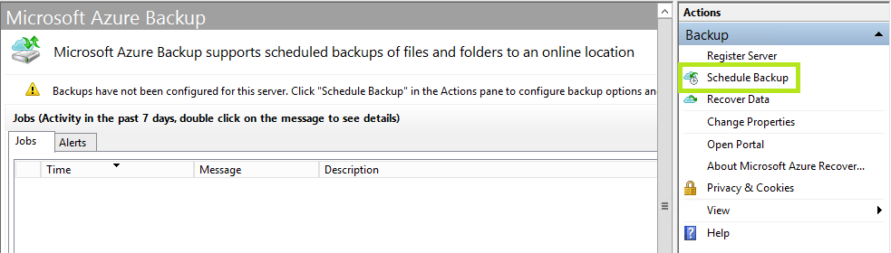 Nun kann die Auswahl der zu sichernden Ordner im Agent selbst erfolgen. Dazu muss das Microsoft Azure Backup über die Verknüpfung auf dem Desktop gestartet werden und über die Option Schedule Backup die Konfiguration erfolgen.