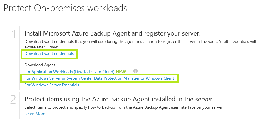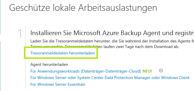 Im nun folgenden Schritt laden wir die Vault credentials und den Azure Backup Agent (Client) herunter, wie im folgenden Bild gezeigt.